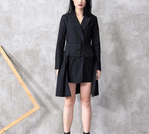 The Blazer features a crisp pinstripe exterior, and a slim European fit perfect for the progressive modern woman. Long-tail back panel design, and detailed construction throughout make this piece one of this season’s most anticipated new additions. Walk tall.